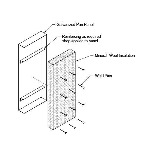 The galvanized steel SAF Spandrel Pans can be custom fabricated to fit openings of various spandrel area shapes and depths. InsulSAF M5000 Spandrel Pans can also be fabricated with 3000 Series Aluminum Alloys. Pan insulation is secured by resistance welded pins. Custom SAF Spandrel Pans can be scheduled to arrive on site ready for installation. They attach to the cladding frame work using standard mechanical fasteners.