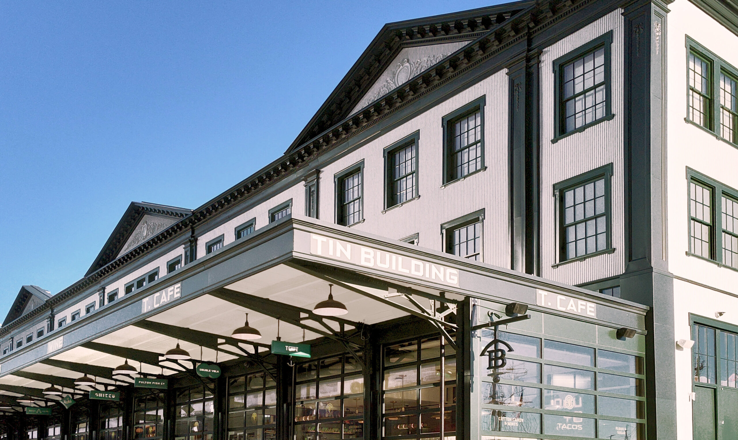 The renovation was comprehensive since the building needed to be moved back 32 feet and raised approximately six feet. Crews also needed to restore the entire foundation. The new structure now gives diners unobstructed views of the Brooklyn Bridge along with a plethora of dining options, many inspired by chef Jean-Georges. Completed, the Tin Building features six full-service restaurants, four bars, and six casual counters as well as retail spaces and private dining options. From the curb, exterior design choices were critical in honoring its original look.