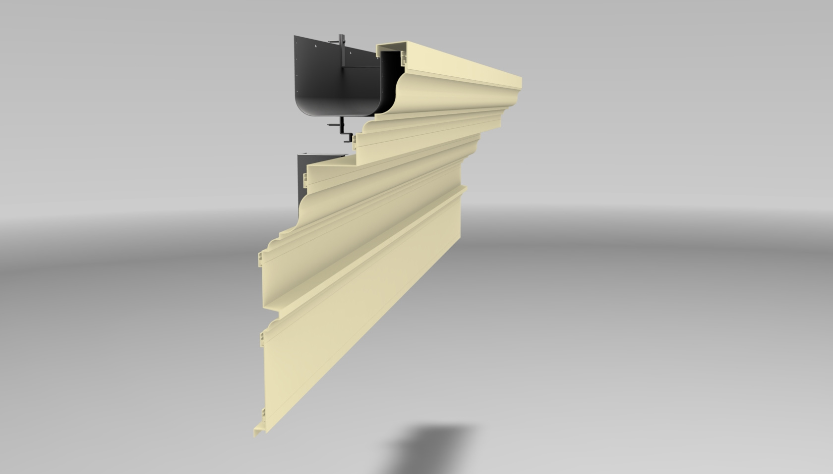 Extruded aluminum cornice boasts a large entablature, small depth, and features an Internal Concealed Gutter System. A frieze and architrave finish its lower portion. Easily adapts to our popular concealed internal drains, eliminating exposed downspouts.