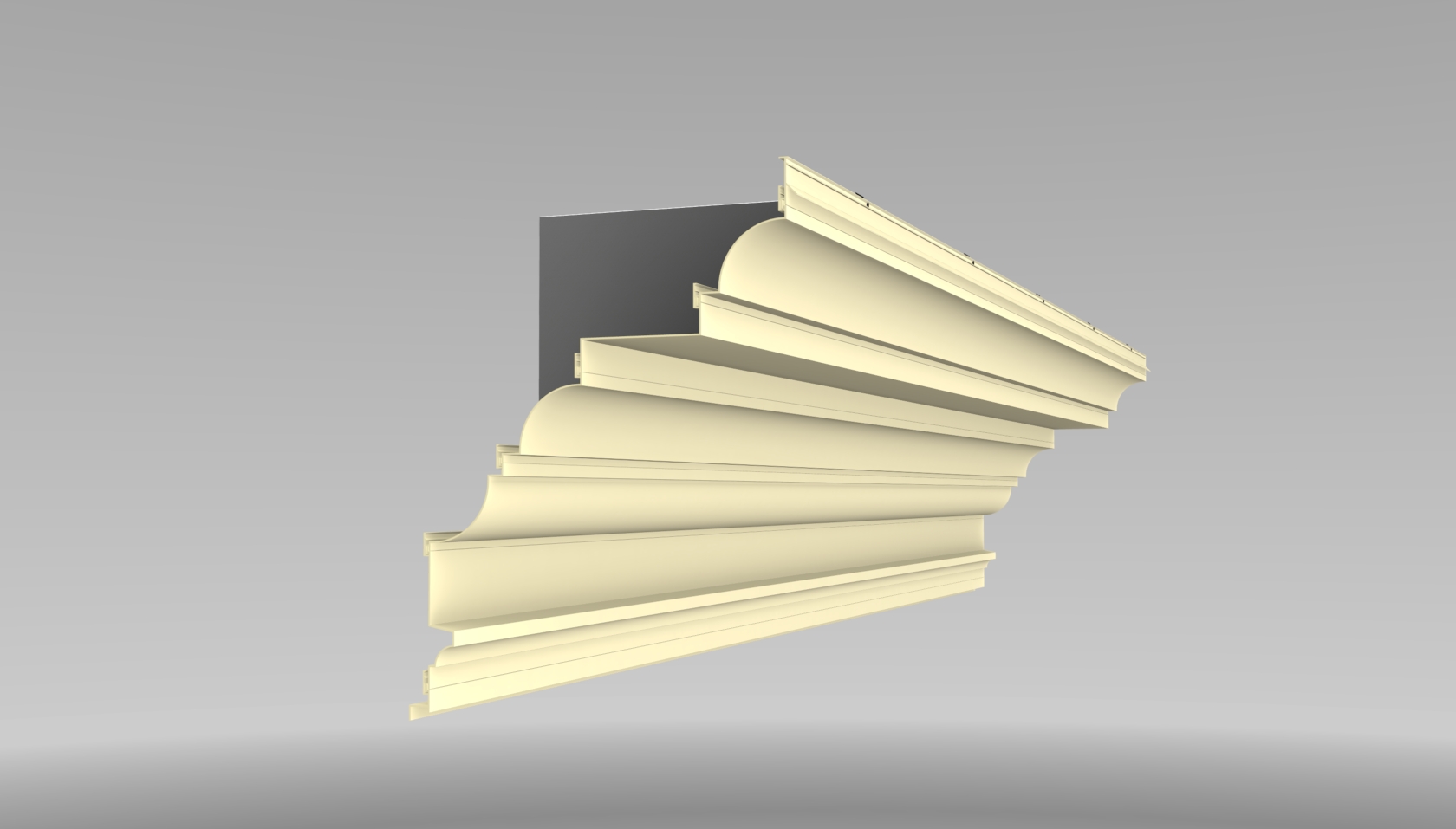 Beautifully sculptured cornice features a large entablature, concealed internal gutter, and a variable width soffit.  The variable with soffit allows to to change cornice depth. The soffit can be solid or vented.
