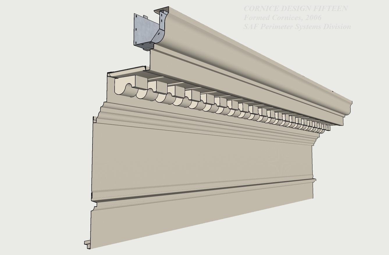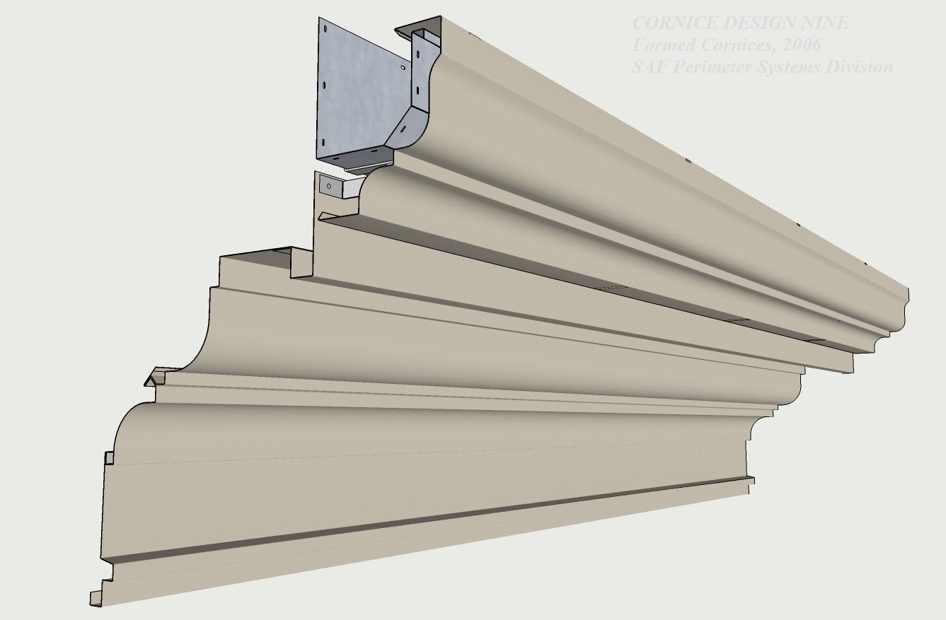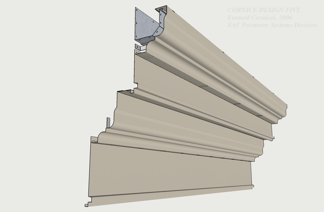 | Using profiles from SAF Cornice Mouldings, Versa Cornice is a product developed to convert a dull parapet coping into a visually exciting sculptured roof edge. Designed for both retrofit and new construction, Versa-Cornice attachment brackets fit all SAF Perimeter Systems coping caps and most other parapet caps or applications. | ||||